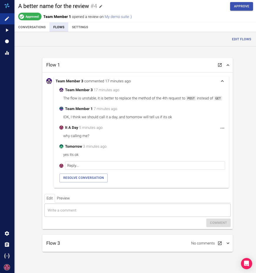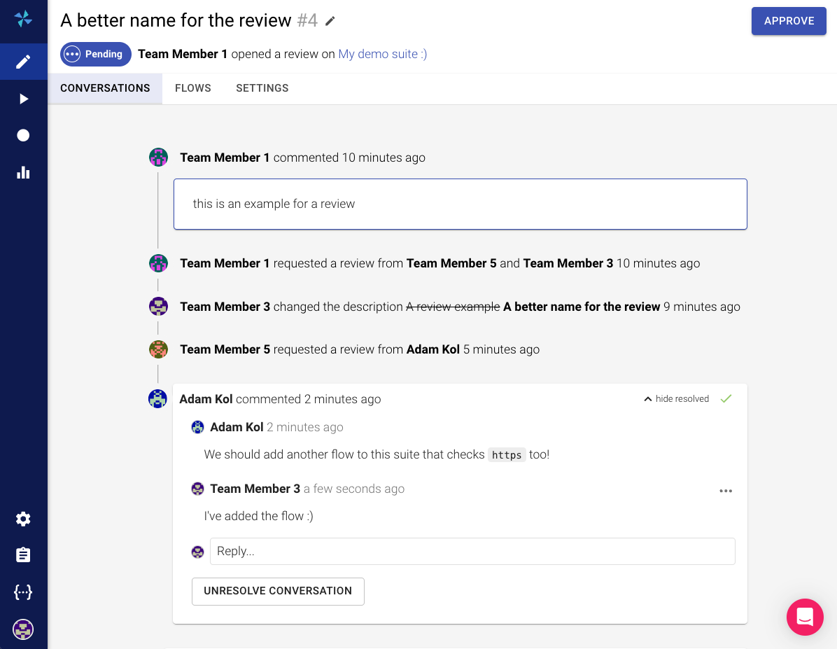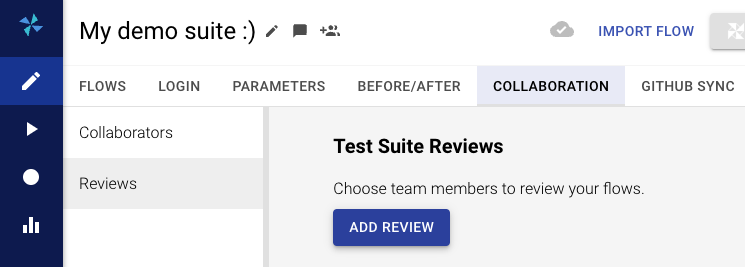 "Teamwork makes the dream work." - John C. Maxwell. A team that works collaboratively on a suite can review each other's tests and make the best out of it. Inside COLLABORATION -> Reviews, a new review request can be created. A review allows to discuss and suggest changes in a suite or specific flows.