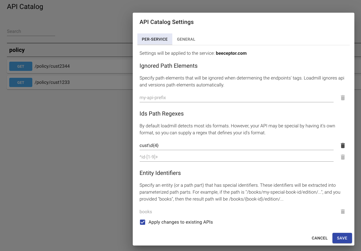 Custom id patterns, such as prefixed/suffixed IDs may be not recognized automatically during the mapping stage. Use entity IDs mapping settings to prevent duplicate APIs, to streamline catalog organization and when you recognize static IDs in the api-catalog.