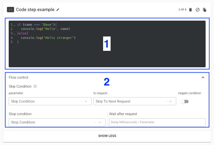 2. Flow control - Allows skipping to another step, stopping the flow and add wait time after step execution.