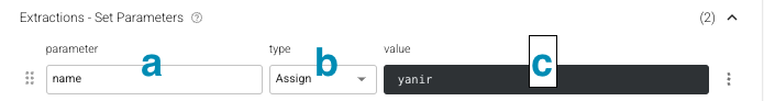 2. Assignment method/type - A selection of methods that can be used to acquire the value for the parameter. The available methods are: Assign, JSONPath, Clojure, xPath, RegExp, Header and WebSocket. For detailed explanation about each one of the methods please refer to the [Extractions documentation](https://docs.loadmill.com/test-editor/set-parameters-extractions).